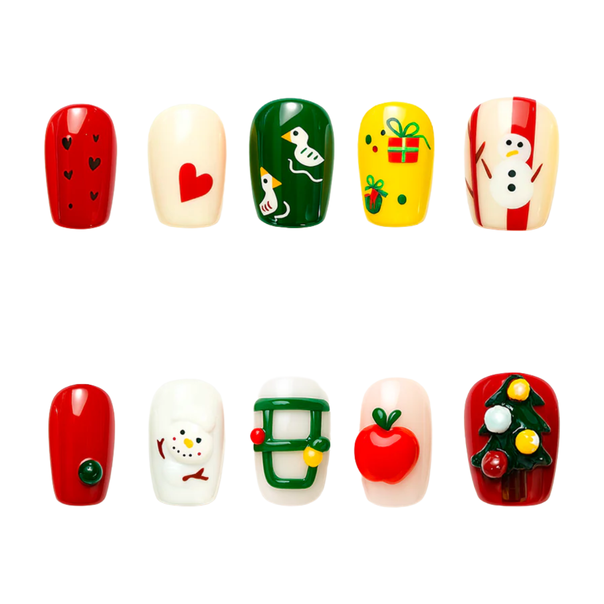 Joyful and bright, Cheerful Snowman Christmas press-on nails mix red, green, and yellow tones with 3D snowmen, apples, and presents. A colorful, heartwarming Christmas nails design that brings fun to every winter moment.