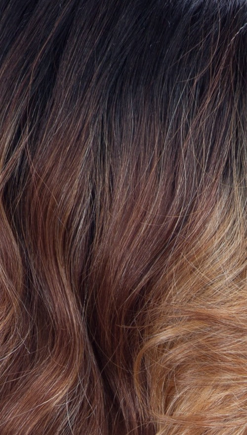 SHAKE N GO HD lace front wig long wavy brown blonde highlights with middle part on smiling model