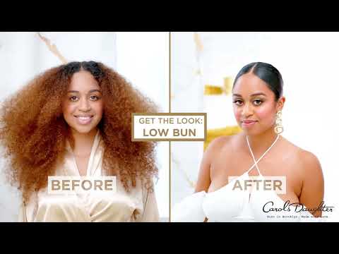 CAROLS DAUGHTER Goddess Strength before and after showing frizzy 3B hair smoothed into bun using hair smoothing and shaping balm