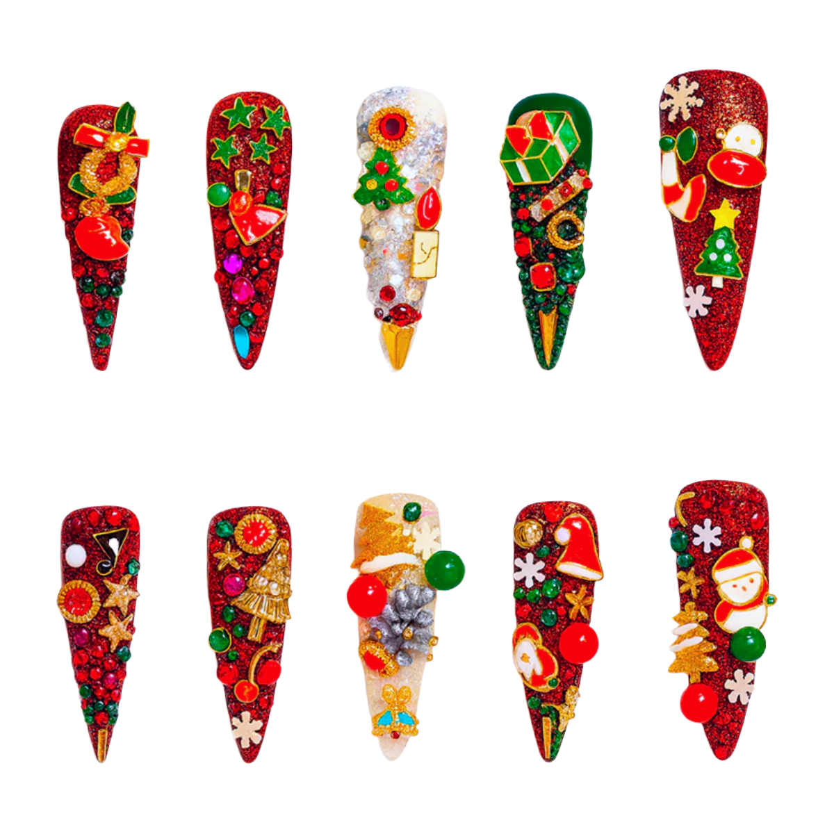 Celebrate in color with Joyful Gala press-on nails — a bold multi-charm Christmas design full of glitter, ornaments, and miniature Christmas trees. The most expressive Christmas nails for anyone who loves maximalist holiday style.
