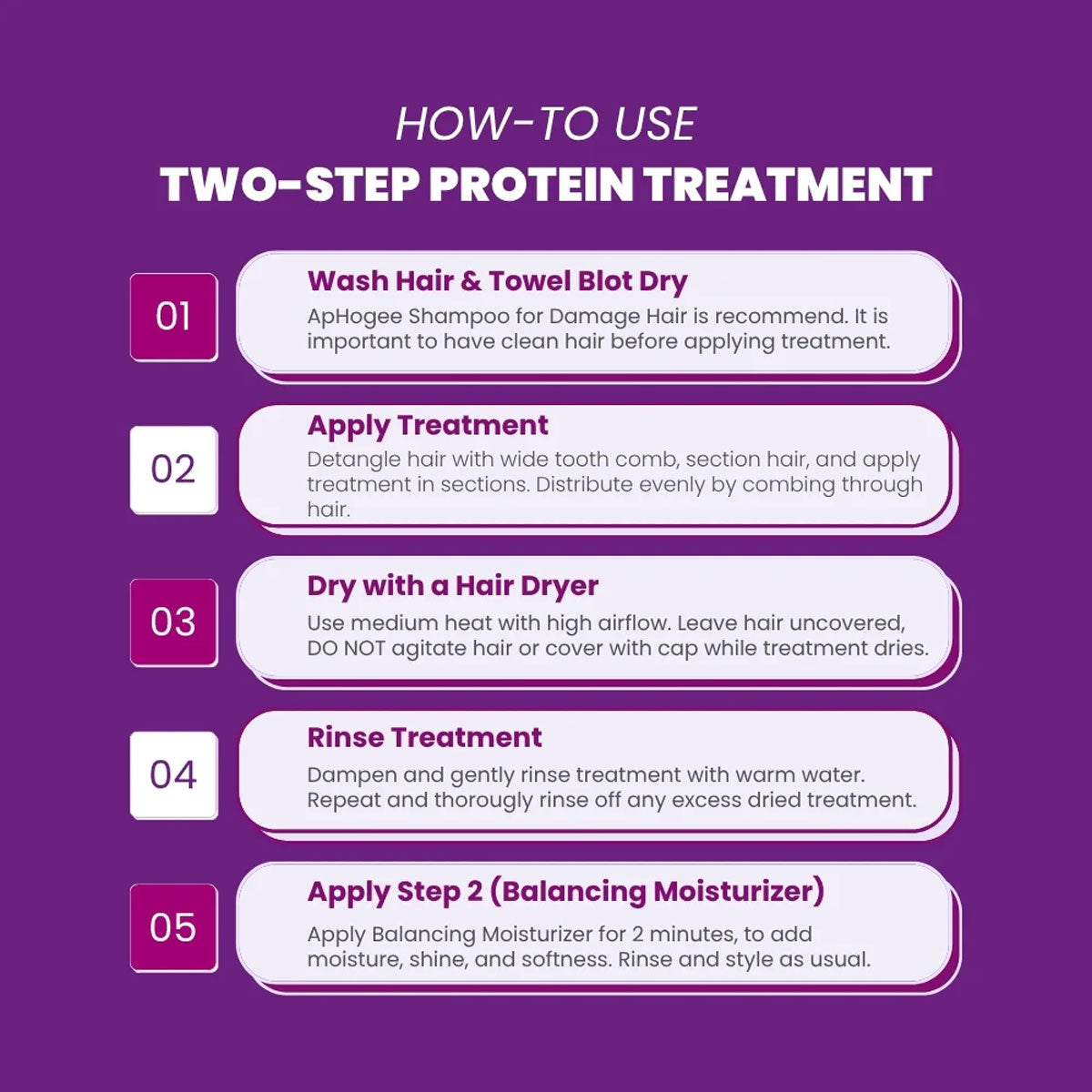 Le traitement protéiné en deux étapes est un produit de salon unique en son genre, contrairement à tous les produits disponibles à domicile. Ce traitement protéiné unique est formulé à base de magnésium et de protéines modifiées qui fusionnent avec les cheveux sous l'effet de la chaleur. Résultat : une réduction drastique de la casse pendant 4 à 6 semaines. Pendant le traitement, le traitement durcit dans les cheveux, signe évident d'un effet exceptionnel. Pour des résultats optimaux, un casque-séchoir est nécessaire. Après rinçage et application de la Crème Hydratante Équilibrante, les clients sont stupéfaits des résultats.