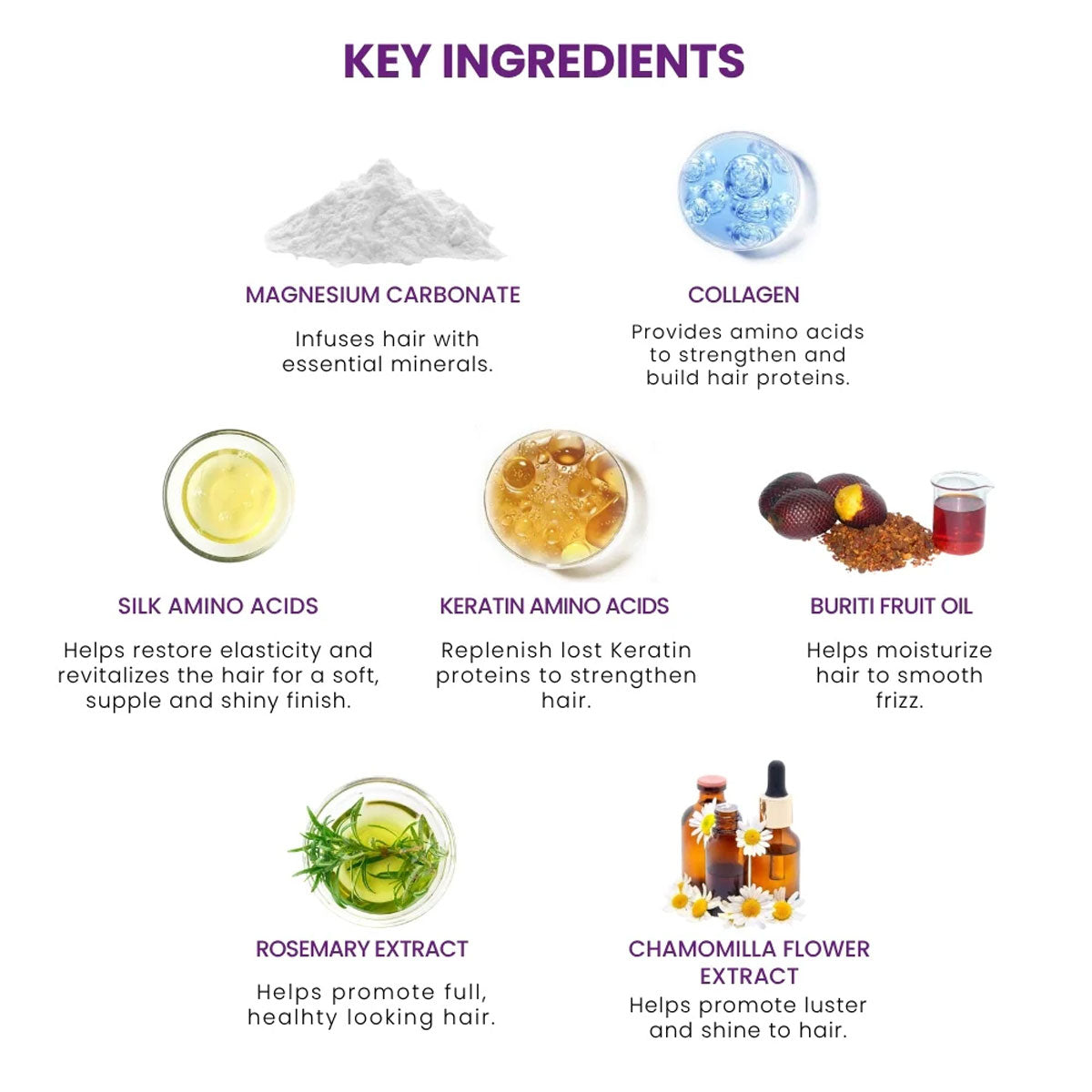 Eau (Aqua, Eau), collagène hydrolysé, acide citrique, sulfate de magnésium, imidazolidinone, panthénol, acétate de tocophéryle, huile de fruit de Mauritia Flexuosa, protéine végétale hydrolysée PG-propyl silanetriol, phytantriol, carbonate de magnésium, cocamidopropyl bétaïne, diméthylol urée, triméthylsiloxyamodiméthicone, C11-15 Pareth-7, C12-16 Pareth-9, glycérine, trideceth-12, DMDM hydantoïne, parfum (parfum), linalol.
