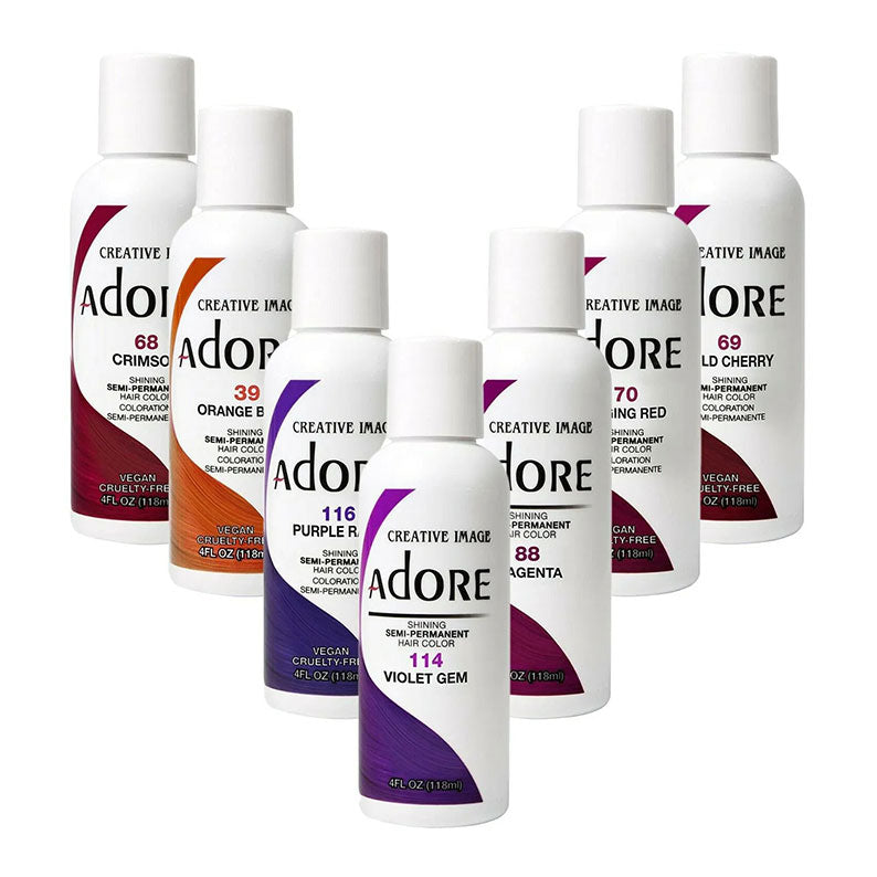 La gamme de colorations semi-permanentes Adore propose une large gamme de teintes, des teintes naturelles aux couleurs de l'arc-en-ciel, en passant par des tons pastel vifs et des tons profonds. Sublimez votre style dès aujourd'hui avec la coloration Adore !