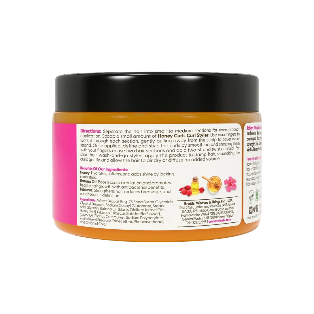 Taliah Waajid Honey Curls Curl Styler - Defines curly hair and deeply moisturizes. Infused with honey for hydration, hibiscus for strength and shine, and batana oil for scalp and hair health.